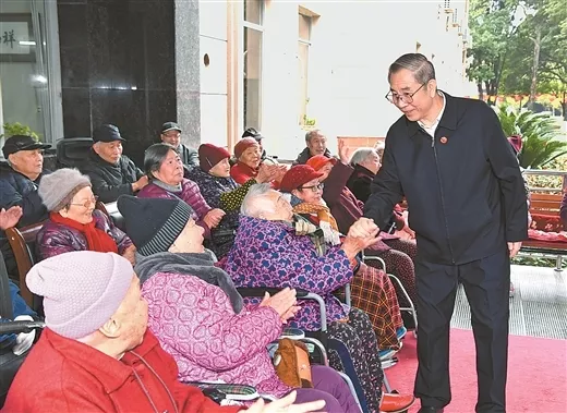圖為12月12日,全國政協副主席、中央代表團副團長馬飚在仙源公司夕陽紅養老中心看望老人。